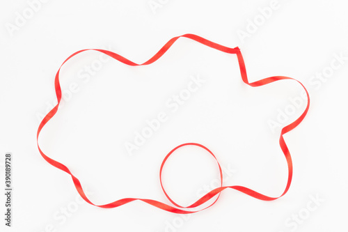 Fototapeta premium Top view of Red ribbon isolated shiny rolled on white background. Flat lay view.