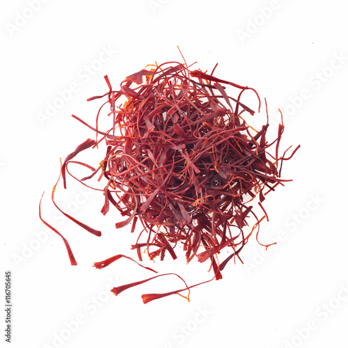 © niteenrk, Naklejka premium Top View of Red Saffron Threads on White Background Shot in Studio