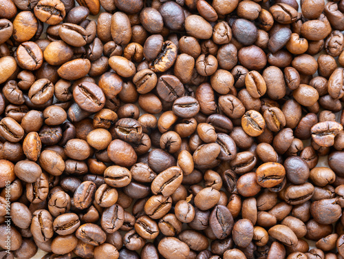 © PhotOleh, Fototapeta premium Top view of scattered coffee beans