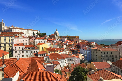 Fototapeta premium Top view of the red tiled roofs of Lisbon