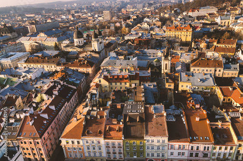 © Alona Dudaieva, Fototapeta premium Top view of the roof of an old European city - Lviv.
