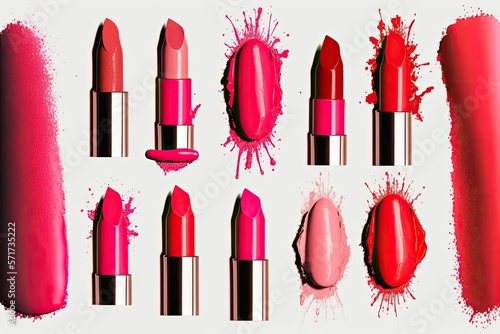 © Nataly, Obraz premium Top view of the variation of feminine lipsticks in different shades with smudge effect on the white background. AI generative