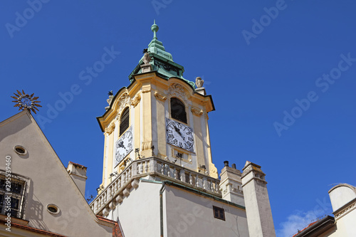 © Gelia, Fototapeta premium Top view of tower of old town hall building in Bratislava old town, Slovakia. The Old Town Hall is located between the Main Square and Primate’s Square