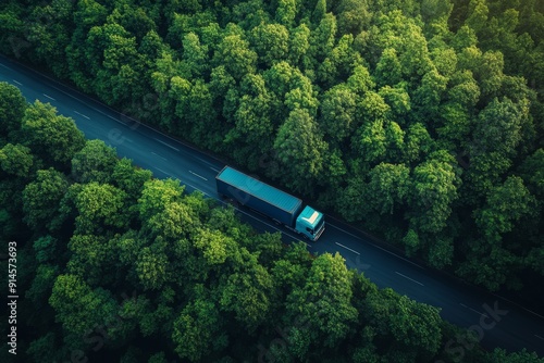 © Bargais, Fototapeta premium Top view of truck driving on highway road in green forest.