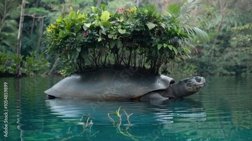 Fototapeta premium Top View of Turtle with Plant Nest on Shell