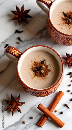 Fototapeta premium Top view of two ceramic mugs filled with warm spiced chai tea, surrounded by cinnamon sticks, star anise, and cloves on a marble surface, evoking cozy autumn vibes