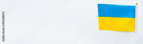 Fototapeta premium Top view of ukrainian flag on white background, banner.