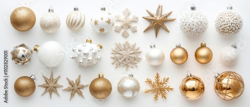 © Adi, Fototapeta premium Top view of white and golden Christmas decorations arranged isolated on white background