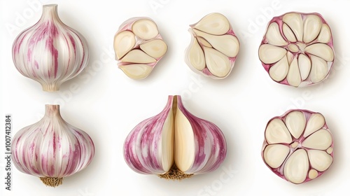 Fototapeta premium Top View of Whole and Cut Purple Garlic Bulbs on a White Background