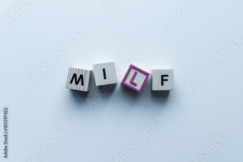 © LIGHTFIELD STUDIOS, Obraz premium top view of wooden cubes with word Milf on blue tabletop