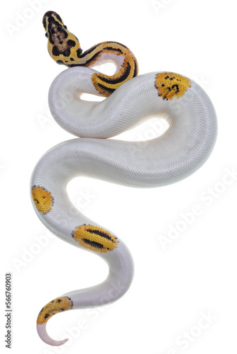 © Nynke, Fototapeta premium Top view of young Piebald Ball Python aka Python Regius snake. Very high on white with button like yelow with black spots or dots. Isolated cutout on a transparent background.