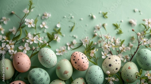 Obraz premium Top view painted pastel color Easter eggs with spring flowers on green loan...