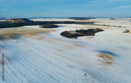 Fototapeta premium Top view photo of a winter suburban landscape with snowy fields, meadows and...