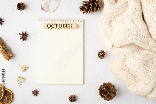 © ActionGP, Obraz premium Top view photo of white scarf notebook with inscription october pine cones dried lemon slices cinnamon sticks golden binder clips and stylish glasses on isolated white background with blank space