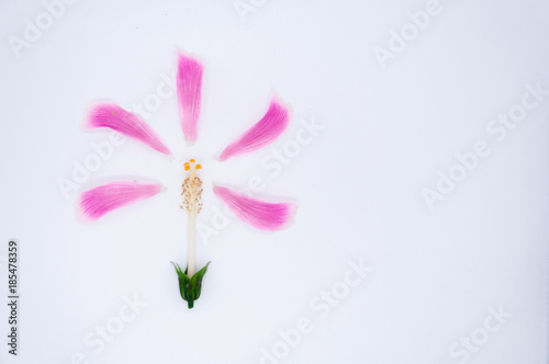 Naklejka premium top view pink petal of hibiscus flower around pollen on white background