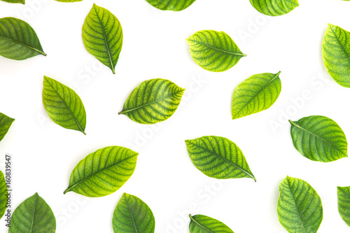 © Cozine, Fototapeta premium Top view shot of the green leaves flat lay on white background