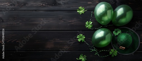 © Natawut, Naklejka premium top view st patricks day four leaf clover, balloons, leprechaun's hat on rustic black wooden table