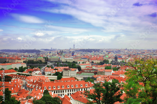 © bbgreg, Fototapeta premium Top view to red tile roofs of Prague city Czech republic. Typical Prague houses. Wide angle panorama.