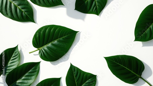 Obraz premium Top View White Background Cosmetics Sales Promotion Layout - Green Leaves Shadows