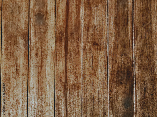 © Apichai, Naklejka premium Top view, wooden table blurred dark brown background texture design blank for text, Web background idea or brochure, illustration, advertise product, gradiant wall