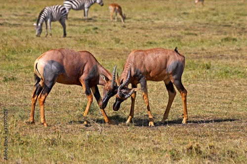 Naklejka premium TOPI damaliscus korrigum, Males fighting, Masai Mara Park in Kenya