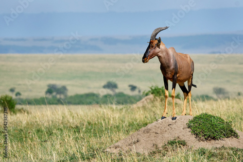 Naklejka premium Topi (Damaliscus lunatus jimela) standing on an anthill mount with the landscape behind in masai mara, Kenya