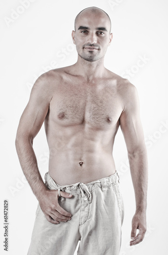 Fototapeta premium Topless bodybuilder showing his fit body with six pack abs.