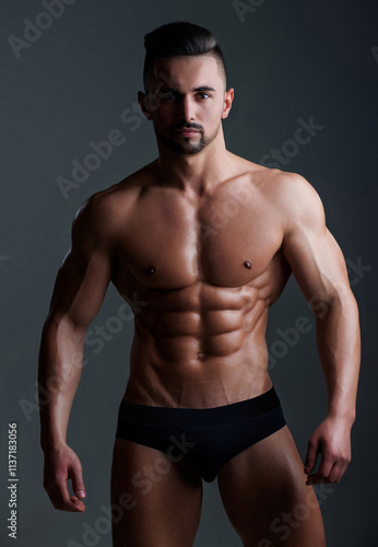 © Volodymyr, Fototapeta premium Topless man with muscle. Sexy male body. Handsome sexy model. Shirtless muscled male model. Man with a naked torso. Muscular young man with perfect body stripping. Sexy man. Seductive guy.