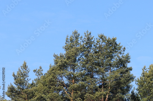 © polakravis, Obraz premium tops of pine trees on a background of blue sky