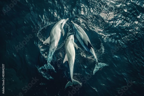 © Surachetsh, Fototapeta premium Topview drone shot, a scene of playful dolphins soaring above breaking waves, embodying the essence of sea life and the splendor of marine animals in their natural environment.