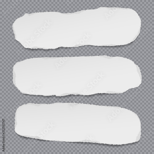 Obraz premium Torn white blank and grainy note, notebook paper strips, pieces stuck on grey background. Vector illustration