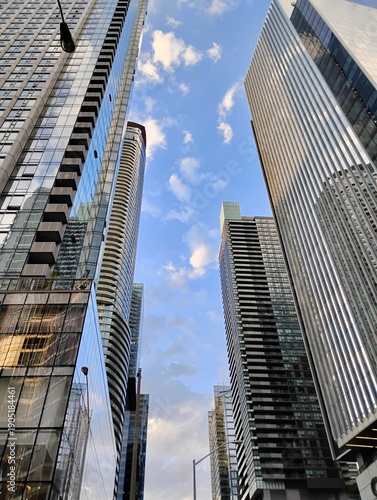 © Cassandra, Naklejka premium Toronto, Ontario, Canada - June 21, 2025: Downtown Toronto skyline looking upward