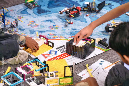 © VisualArtStudio, Fototapeta premium Toronto, Ontario, Canada - November 30: Group students working on robotics project for the FIRST LEGO League (FLL) competition. STEM eduction concept.