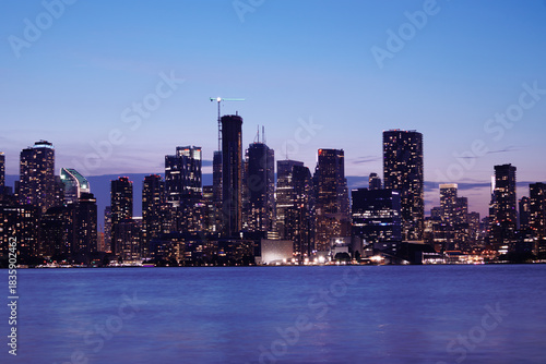 Naklejka premium Toronto skyline at dusk with illuminated city lights reflecting on the water, vibrant urban night view. g.