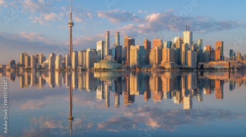 Naklejka premium Toronto Skyline Reflects on Lake During Dawn With Soft Light Casting Shadows...