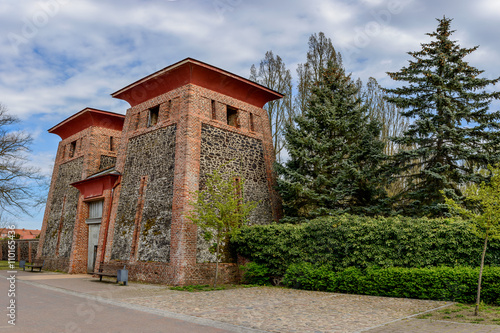 © ebenart, Fototapeta premium Torpylone als Glockentürme am Friedhof Ludwigslust