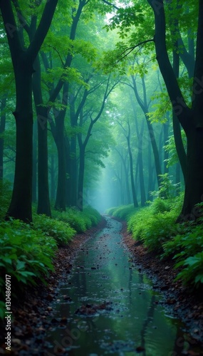 Naklejka premium Torrential rain lashes Osaka forest; trees drenched, paths flooded, woodland,...