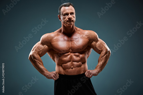 Fototapeta premium torso of attractive male body builder on gray background.