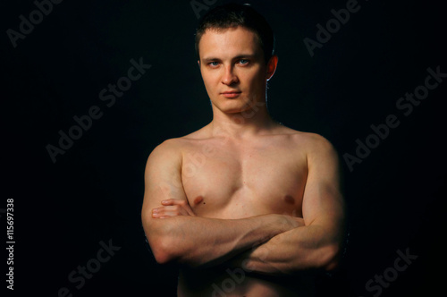© radiomarlena, Fototapeta premium Torso of strong man against dark background