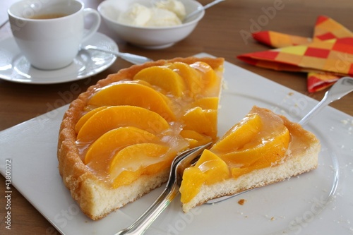 © Nieschefart, Fototapeta premium Tortenboden belegt mit Pfirsichen