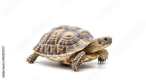 © Nnoo, Obraz premium Tortoise walking on white background slow moving reptile with brown and yellow shell claws visible gentle creature