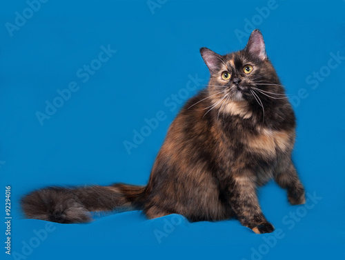 Obraz premium Tortoiseshell cat sitting on blue