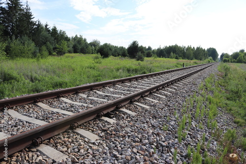 Fototapeta premium Tory kolejowe wzdłuż zielonych łąk i lasów