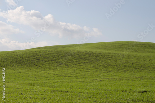 © Jacopo, Fototapeta premium Toscana, Italia, Val d'Orcia, veduta su un campo verde e cielo azzurro