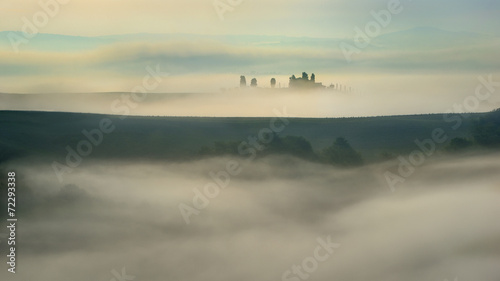 © janmiko, Fototapeta premium Toscania, Włochy, Krajobraz wiejski w mgłach