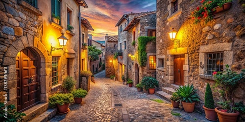 © renuga sachan, Fototapeta premium Tossa de Mar, Spain: Charming Old Houses at Dusk - Low Light Photography