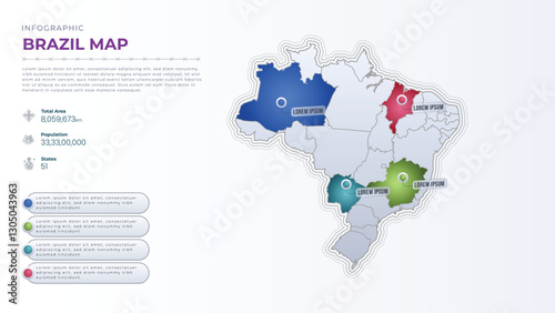 © bakarali, Naklejka premium Total Area, Papulation, States & More Detailed Infographic Map of Brazil. Brazil country map infographic colored vector template with regions and pointer marks.