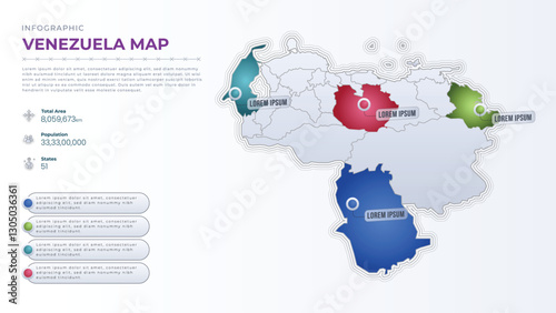 © bakarali, Naklejka premium Total Area, Papulation, States & More Detailed Infographic Map of Venezuela. Venezuela country map infographic colored vector template with regions and pointer marks.