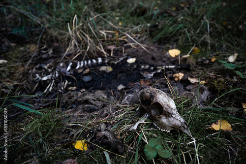 Obraz premium Totes fasst verwestes Tier im Wald. Skelett. Leiche