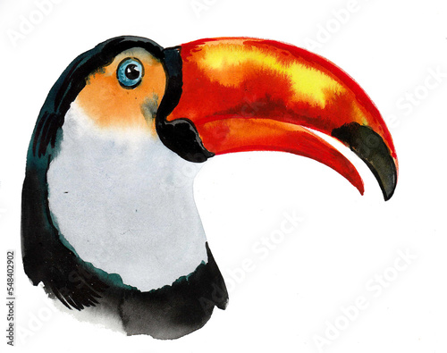 © berdsigns, Obraz premium Toucan bird head. Ink and watercolor drawing